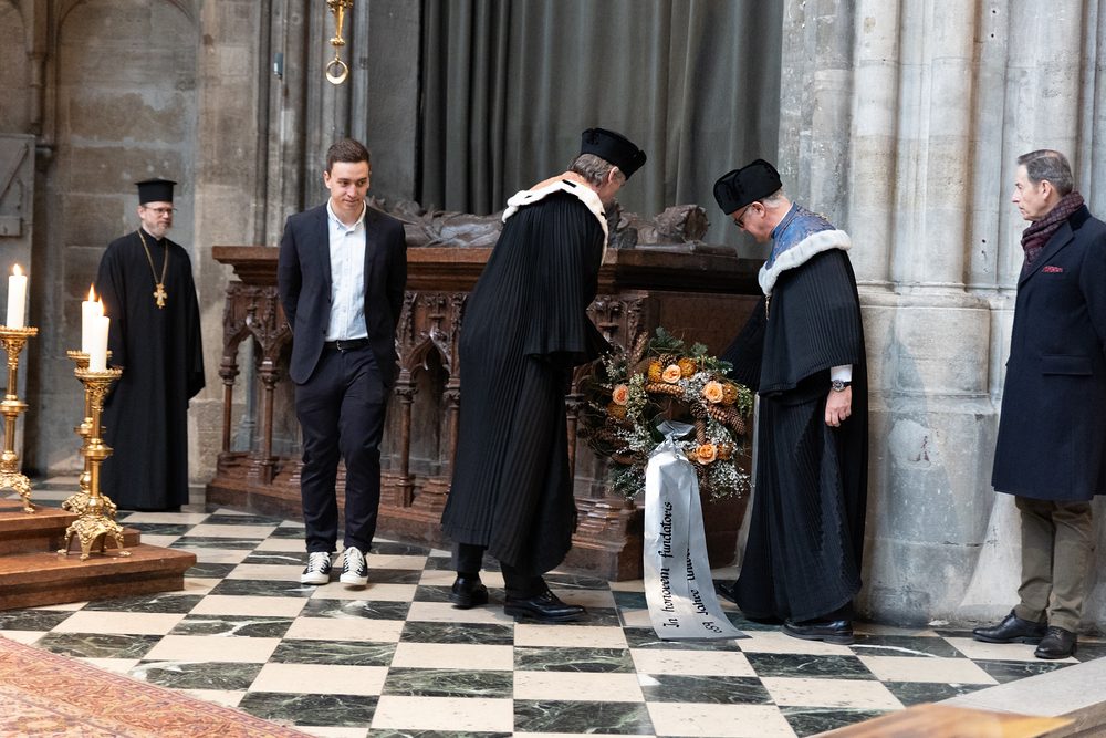 Der „Dies Academicus“ beginnt am Vormittag mit der vom Universitätsbund „Alma mater Rudolphina“ begründeten Tradition der Kranzniederlegung am leeren Kenotaph Rudolfs des Stifters im Stephansdom. Nach dem feierlichen Einzug und der Kranzniederlegung halten ein Vertreter des Domkapitels und der Rektor kurze Ansprachen. Anschließend zieht man gemeinsam vom Seitenschiff des Domes in die Krypta zum Grab Rudolfs des Stifters, wo die Feier nach einem kurzen Gebet endet.